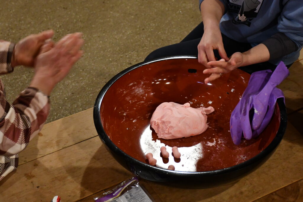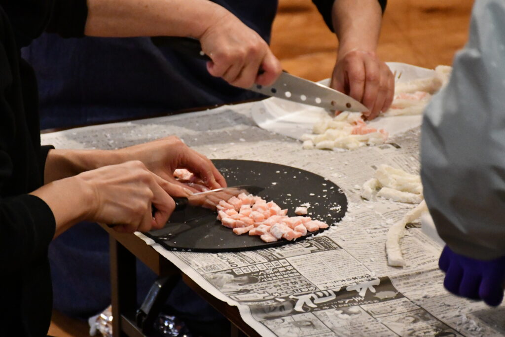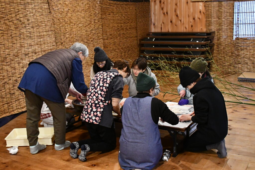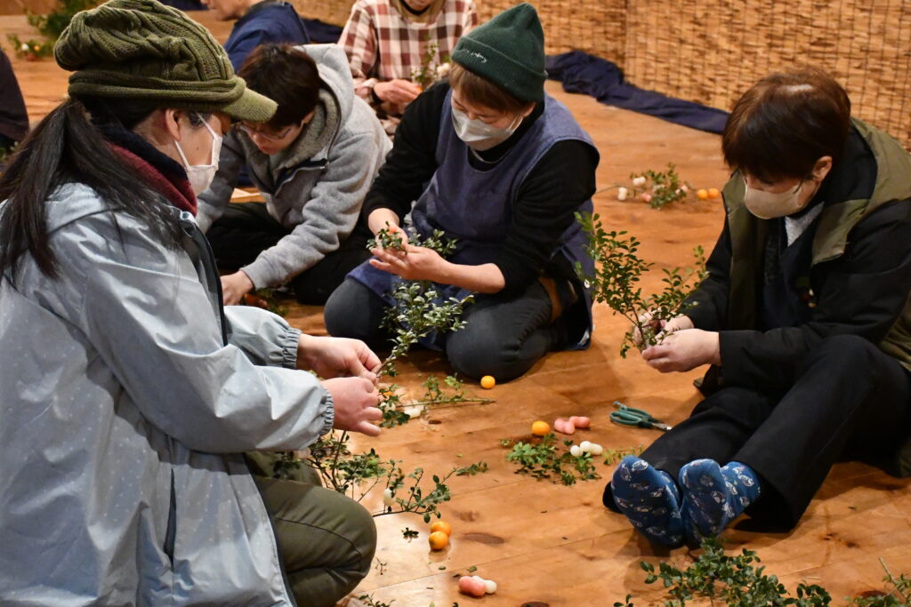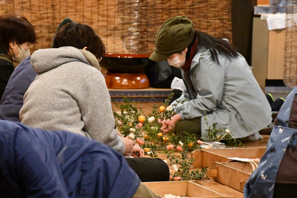 1月13日(火)妻籠観光協会 女性部の皆さんによる、小正月の飾り「まゆだま」と「餅花」作りが行われました! ビンカの木にまゆだまとキンカン、竹に餅花をつけて飾ります。